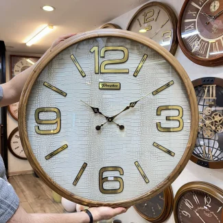 اعداد رومی برجسته با پرداخت طلایی براق روی زمینهی چوب روشن (تقریباً کرم/عسلی)، کنتراست زیبایی ایجاد کرده و خوانایی را بالا میبرد.