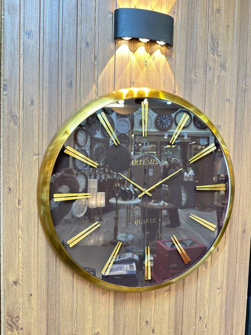 صفحهی مخملی قهوهای تیره نور را لطیف جذب میکند و در برابر انعکاس قاب طلایی، عمق و گرمایی دلپذیر ایجاد میکند. ایندکسهای میلهای طلایی برجسته و عقربههای طلایی صیقلی روی زمینهی مات، حس سکون و اصالت را به نمایش میگذارند.