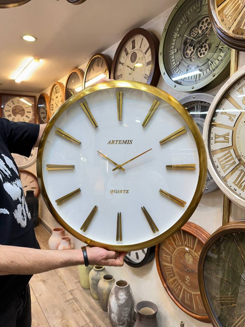 ساعت دیواری مدرن از برند Artemis با بدنه‌ی فلزی رنگ طلایی براق و صفحه‌ی سفید مینیمال، قطر ۶۰ سانتی‌متر، مجهز به موتور تایوانی بی‌صدا و دقیق، و دارای ۳ سال گارانتی شرکتی آرتمیس. ترکیب رنگ سفید و طلایی در این مدل، جلوه‌ای لوکس و ساده پسند برای فضاهای مدرن و کلاسیک ایجاد کرده است.