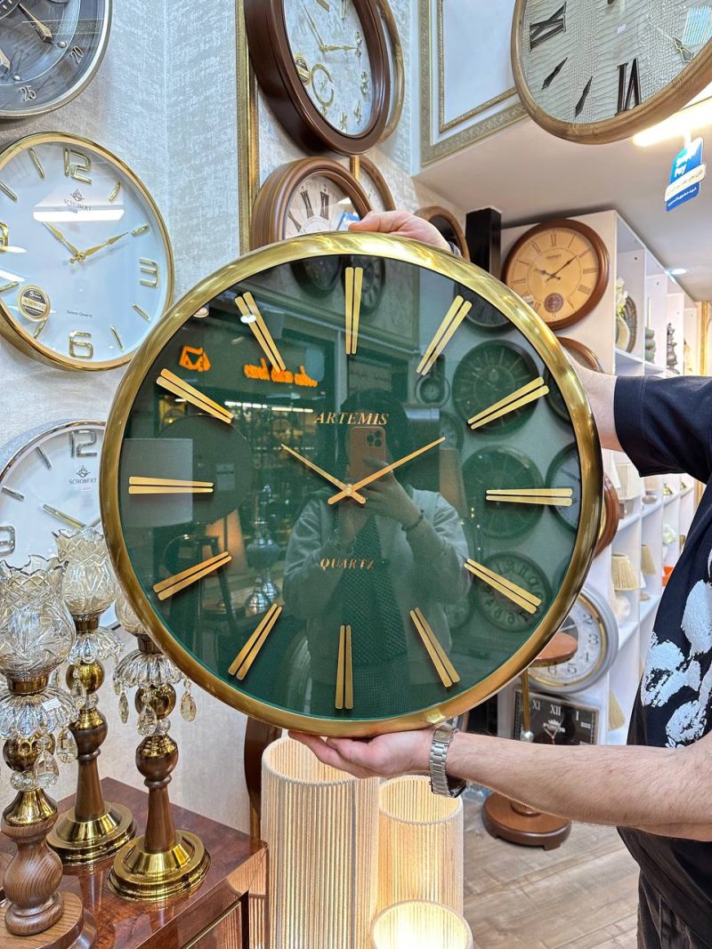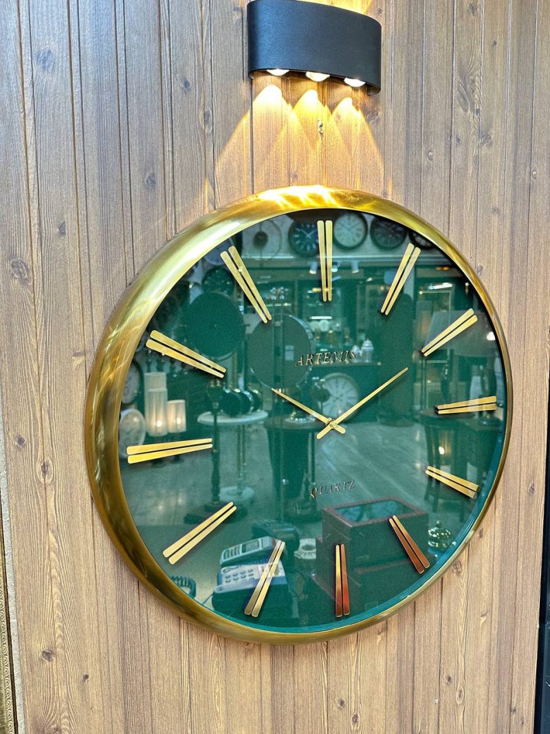 ساعت دیواری لوکس از برند Artemis با ترکیب رنگ سبز زمردی و طلایی براق، بدنه‌ی فلزی مقاوم و صفحه‌ی شیشه‌ای سبز درخشان، قطر ۶۰ سانتی‌متر، مجهز به موتور تایوانی Silent Sweep بی‌صدا و بادوام، همراه با ۳ سال گارانتی شرکتی آرتمیس. جلوه‌ی سبز و طلایی این مدل، حس ظرافت کلاسیک و شکوه مدرن را توأمان در فضا زنده می‌کند.