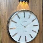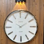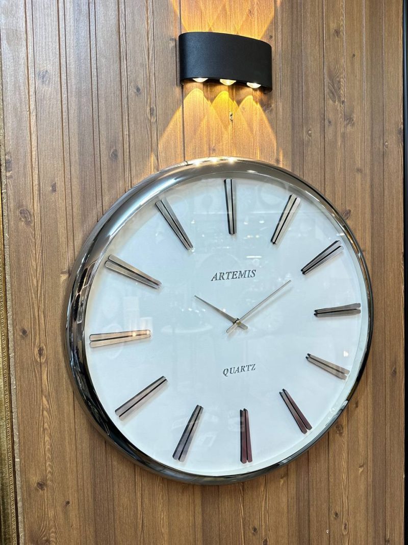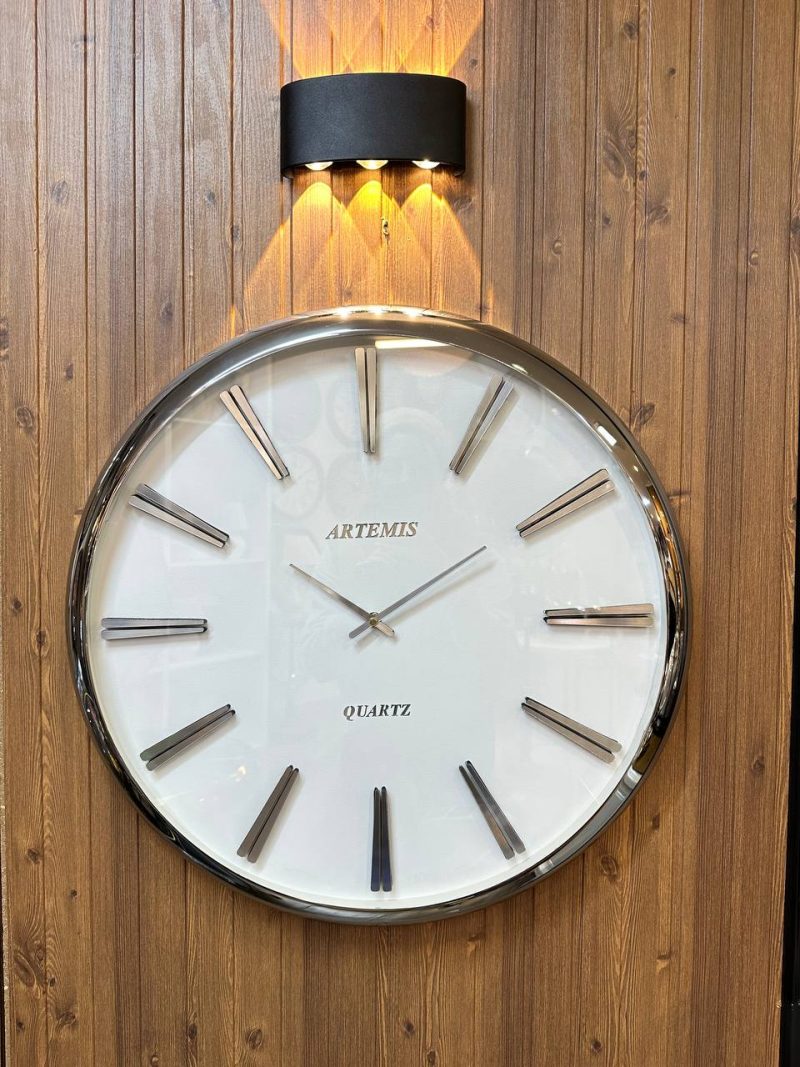 ساعت دیواری مدرن و لوکس از برند Artemis با قاب فلزی نقره‌ای کرومی براق و صفحه‌ی سفید مینیمال، قطر ۶۰ سانتی‌متر، مجهز به موتور تایوانی Silent Sweep بی‌صدا، همراه با ۳ سال گارانتی شرکتی آرتمیس. نمایی ساده و درخشان که برای فضاهای روشن و دکورهای مدرن کاملاً هماهنگ است.