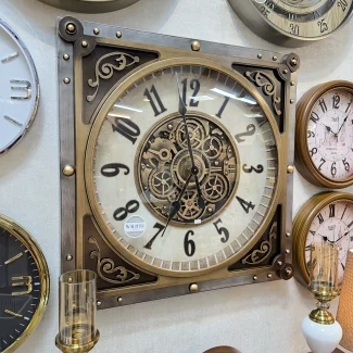 ایندکسهای میلهای طلایی روی سطح شیشهای شناور بهنظر میرسند و مرکز طلایی طراحیشده، نقطهی فوکوس ساعت است. پاندول بلند و همرنگ بدنه، حرکت یکنواخت و آرامی ایجاد میکند که توسط موتور تایوانی دوم کنترل میشود.