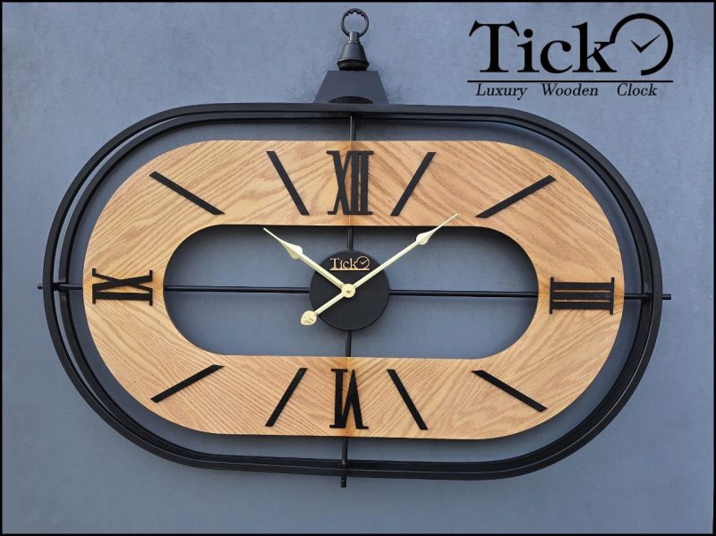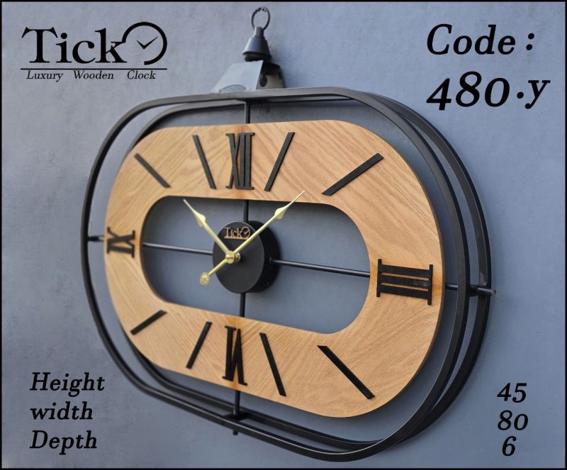 مدل 480Y از برند تیک با طراحی بیضی افقی و تلفیق چوب بلوط گرم و اصیل با فلز مشکی مات استاتیکی، جلوه‌ای ساده اما لوکس ایجاد می‌کند. رنگ استاتیکی فلز باعث مقاومت بالا در برابر خط‌وخش و زنگ‌زدگی می‌شود و دوام ظاهر ساعت را تضمین می‌کند. صفحه ساعت با اعداد رومی مشکی برجسته روی زمینه طبیعی چوب، حس اصالت را با خوانایی بالا ترکیب کرده است. ابعاد ۸۰ در ۴۵ سانتی‌متر آن، این مدل را برای دیوارهای بزرگ و فضای پذیرایی ایدئال می‌کند. موتور تایوانی بی‌صدا، حرکت روان عقربه‌ها را فراهم کرده و گارانتی ۲ ساله موتوری اطمینان از کیفیت را به خریدار هدیه می‌دهد.
