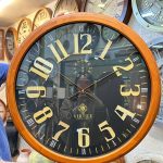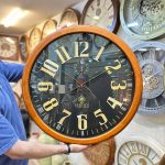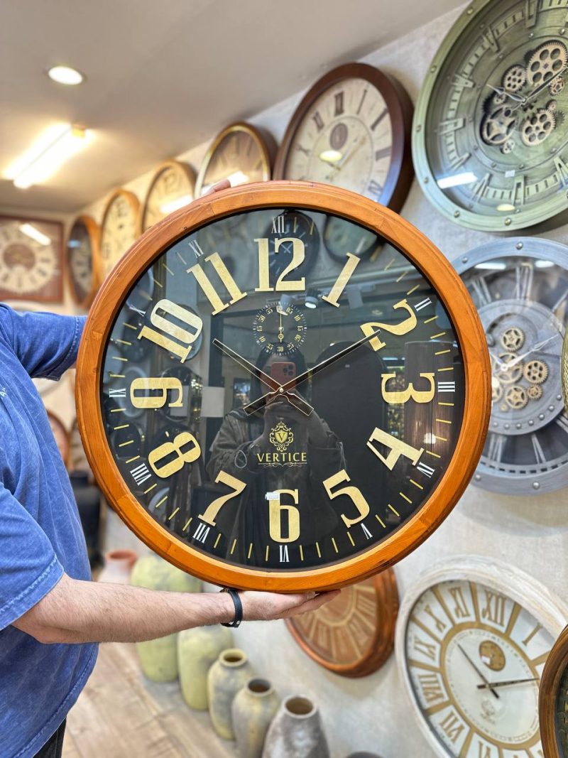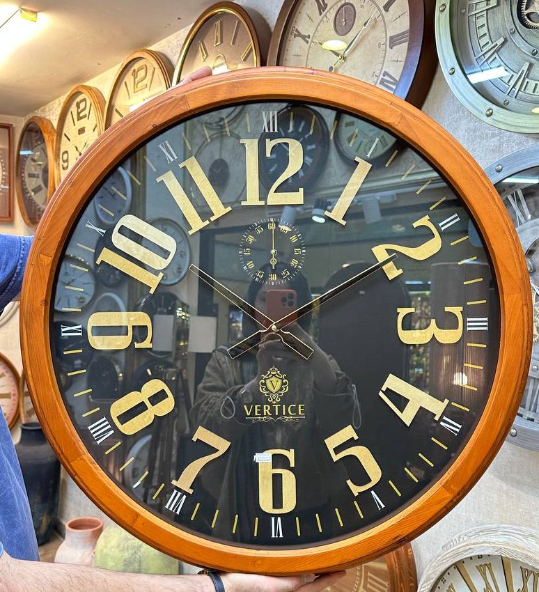 ساعت دیواری دو موتوره ورتیچ مدل 750 قطر 70 سانتی‌متر – بدنه چوبی قهوه‌ای با صفحه مشکی و اعداد کرم
