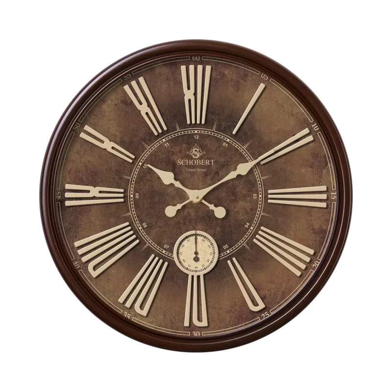 ساعت دیواری شوبرت مدل ۶۴۳۳، نماینده تمام عیار سبک کلاسیک است که با بدنه چوبی قهوهای رنگ و قطر ۶۰ سانتیمتری، حضورش را در هر محیطی به رخ میکشد. صفحه ساعت با طرح پتینه قهوهای و اعداد یونانی (رومی) برجسته به رنگ کرم، حس نوستالژی و اصالت را به فضای شما هدیه میدهد.