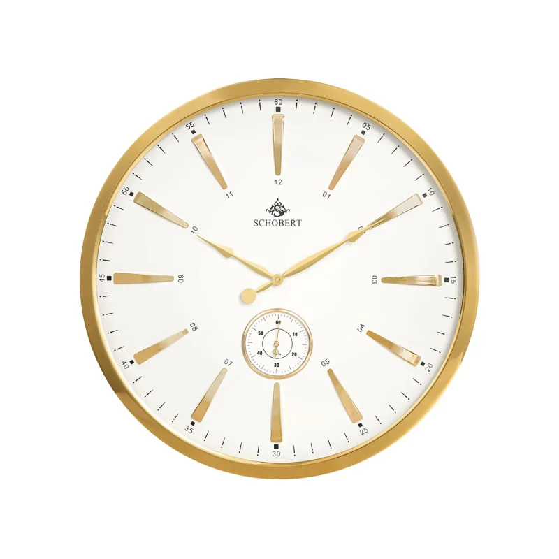 ساعت دیواری با بدنه فلزی طلایی و اعداد خطی برجسته، مجهز به دو موتور بی‌صدای تایوانی و پنج سال گارانتی شوبرت؛ مناسب دکوراسیون‌های شیک و مدرن.
