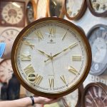 ساعت دیواری شیک با بدنه چوبی، فریم فلزی آبکاری طلایی فورتیک و صفحه کرم پتینه‌ای با اعداد رومی طلایی، قطر 50 سانتیمتر، مجهز به موتور تایوان با 5 سال گارانتی.