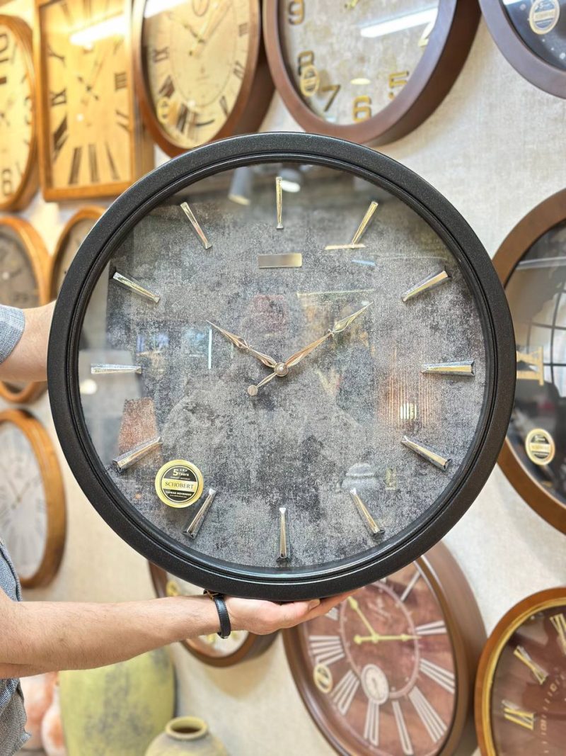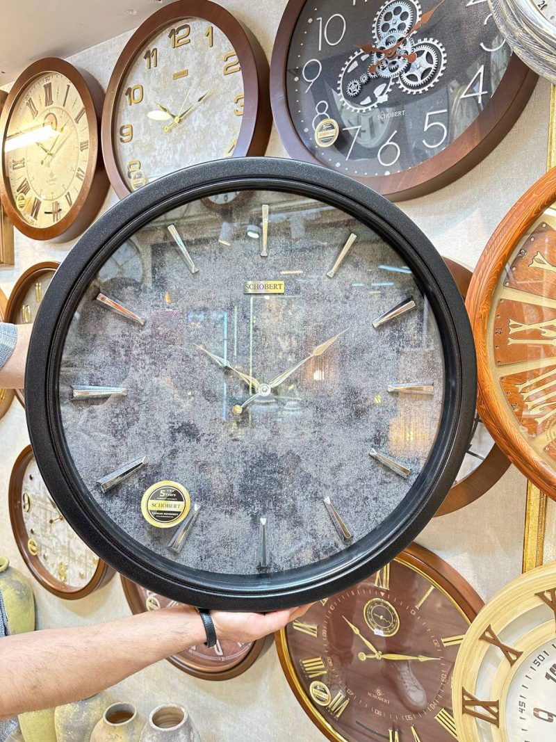 ساعتی با طراحی مینیمال و بدنه چوبی مشکی، قطر ۶۰ سانتی‌متر، مجهز به موتور تایوان Silent Quartz با عملکرد بی‌صدا و گارانتی ۵ ساله شوبرت.