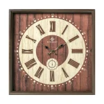 ساعت دیواری مربع چوبی با طراحی کلاسیک، اعداد رومی برجسته و دو موتوره بی‌صدا، مناسب فضاهای لوکس و رسمی، همراه با پنج سال گارانتی شرکت شوبرت.