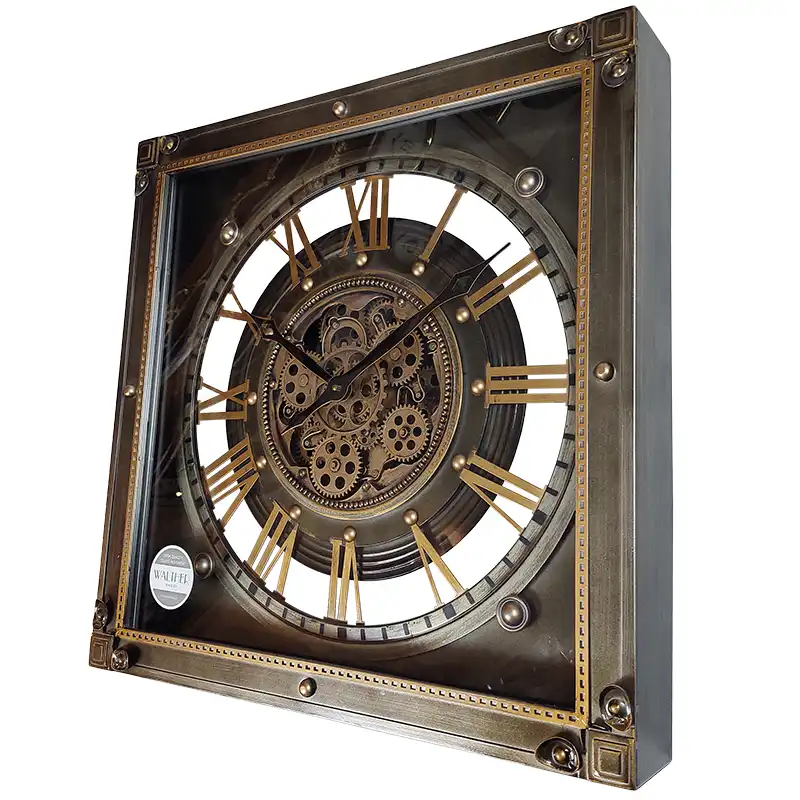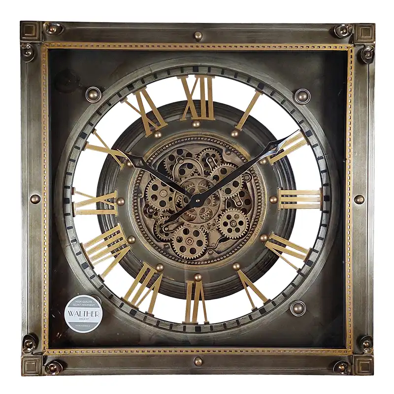 ساعت دیواری والتر مدل 6138 با بدنه فلزی و طراحی مربع‌ شکل، ترکیبی از ظرافت کلاسیک و حس صنعتی. ابعاد 60 در 60 سانتی‌متر، مجهز به دو موتور مجزا برای نمایش زمان و حرکت چرخ‌دنده‌ها، همراه با سه سال ضمانت رسمی شرکت والتر.