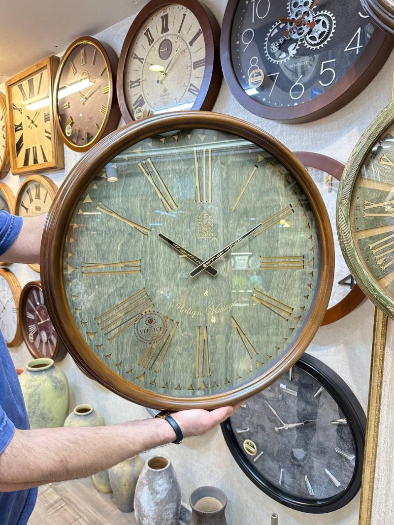 مدل 613 از برند Vertice در سبک Italian Vintage طراحی شده و ترکیب رنگها و متریال آن، حس اصالت اروپایی را به فضا منتقل میکند. قاب چوبی با پرداخت گرم طبیعی، در هماهنگی کامل با صفحه سبز بافتدار و اعداد رومی طلایی قرار گرفته است. عقربههای فلزی مشکی–طلایی کلاسیک با طراحی ظریف، خوانایی بالا و جلوهای شیک را تضمین میکنند.