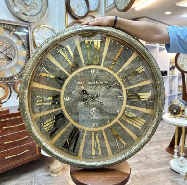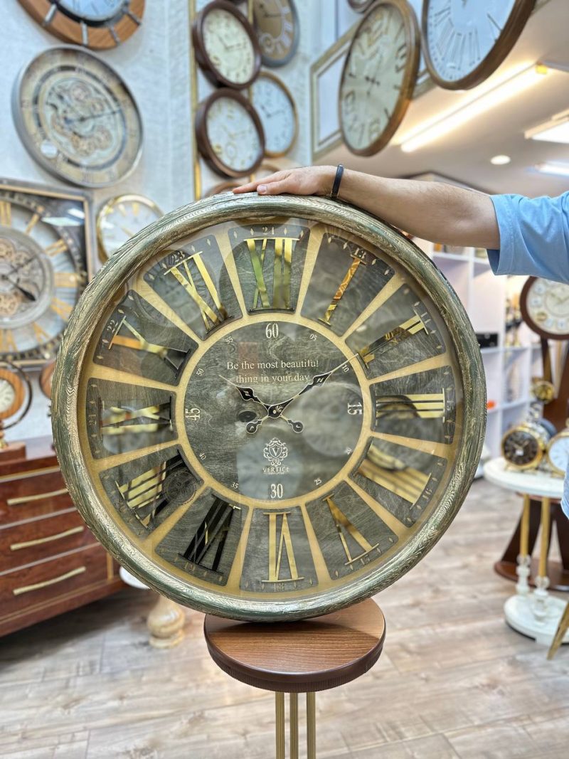 این مدل بخشی از کلکسیون ساعتهای کلاسیک گالری خورشید شب است و با ترکیب رنگ سبز–طلایی، بدنه چوبی و قطر ۹۰ سانتیمتر، به یک قطعه هنری در فضای منزل یا محل کار تبدیل میشود.
