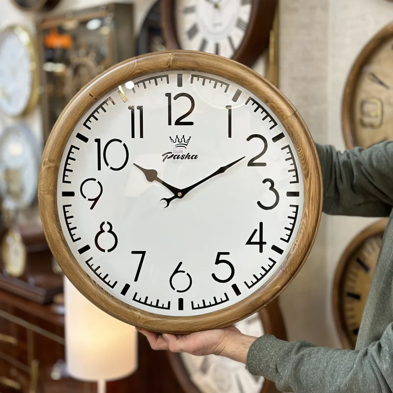 ساعت دیواری پاشا مدل pasha506 ، ساعت دیواری با بدنه چوب طبیعی نراد روسی، موتور آرامگرد، طراحی مینیمال ساعت، ترکیب زیبا رنگ صفحه سفید و بدنه قهوه ای، سایز 50.مناسب سبک مینیمال،مدرن و نئوکلاسیک
