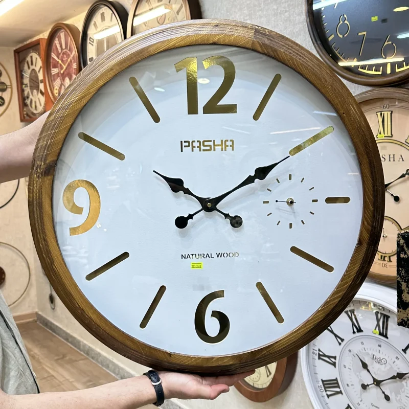 ساعت دیواری پاشا مدل pasha655 ، ساعت دیواری با بدنه چوب طبیعی نراد روسی، موتور آرامگرد، طراحی مینیمال ساعت، ترکیب زیبا رنگ صفحه سفید و بدنه قهوه ای، سایز 65.مناسب سبک مینیمال،مدرن و نئوکلاسیک