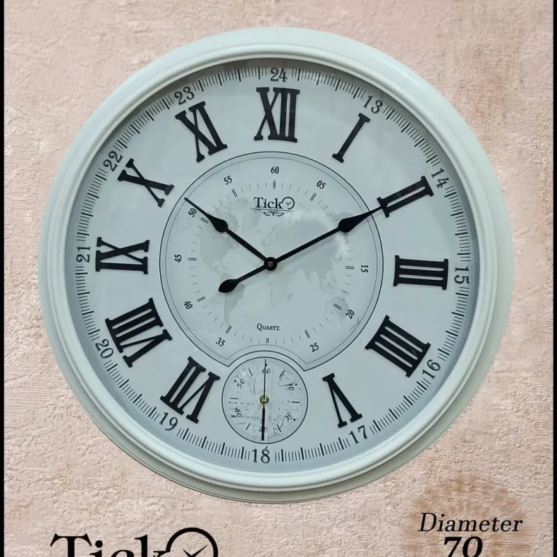 ساعت دیواری برند Tick کد 722 با قطر بزرگ 70 سانتیمتر، از بدنه مقاوم MDF ساخته شده و دارای طراحی خاص با نقش نقشه جهان در مرکز صفحه است. اعداد برجسته یونانی به رنگ مشکی روی زمینه سفید، جلوهای کلاسیک و جذاب به آن بخشیدهاند. این مدل دارای دو موتور تایوانی با عملکرد دقیق و کمصدا بوده که یکی برای نمایش ساعت و دیگری برای ثانیهشمار جداگانه در پایین صفحه تعبیه شده است. همراه با دو سال گارانتی معتبر، این ساعت انتخابی عالی برای دکوراسیون مدرن و کلاسیک به شمار میآید.