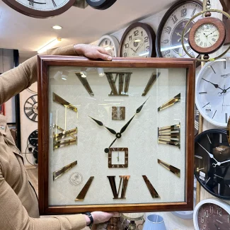 ساعت دیواری چوبی لوکس با طراحی کلاسیک، موتور تایوانی و اعداد برجسته یونانی؛ مناسب برای دکورهای شیک و اصیل.