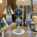 مجموعه‌ای خاص شامل یک ساعت و دو شمعدان با پایه فلزی آبکاری کروم و شیشه ضخیم طوسی رنگ‌شده کوره‌ای؛ گزینه‌ای جذاب برای دوست‌داران دکورهای امروزی و شیک.