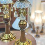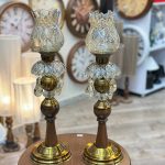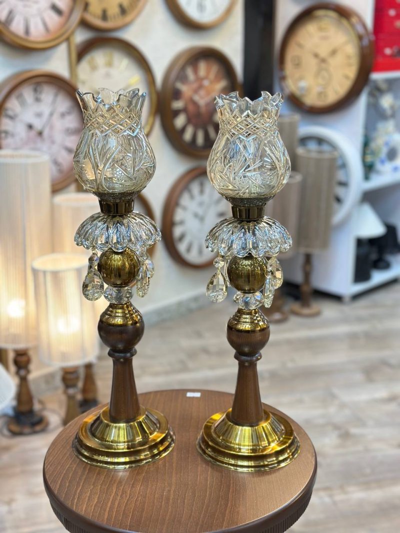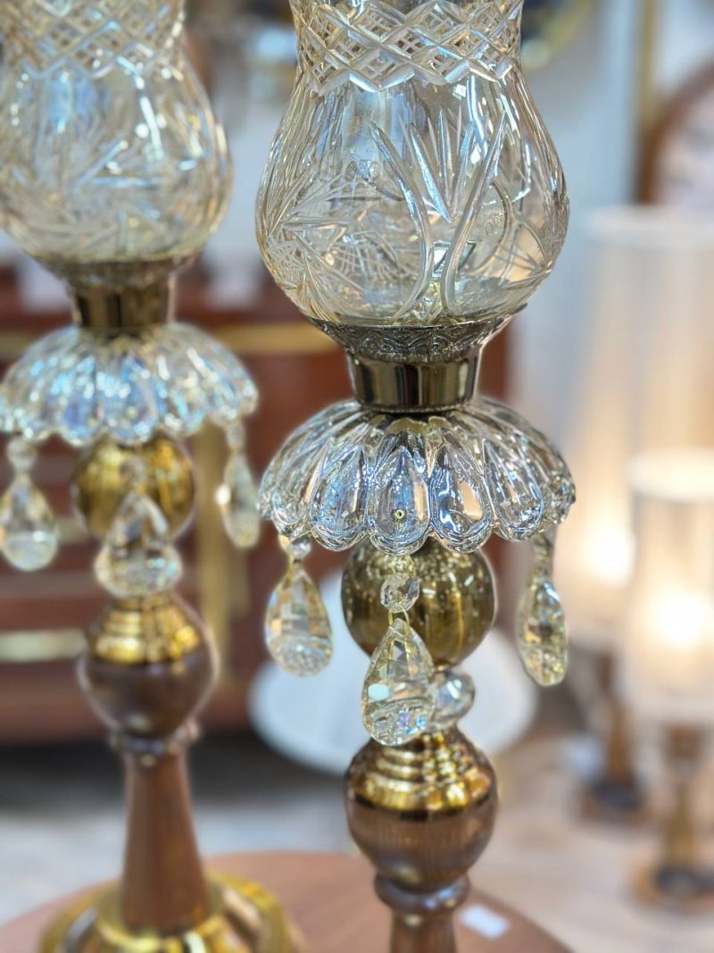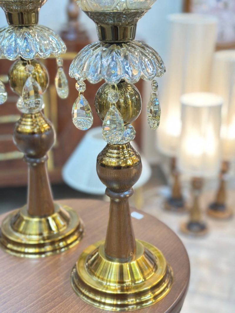 شمعدان ترکیبی چوب و فلز با آبکاری آنتیک، مزین به لاله‌های کریستالی خورشیدی و آویزهای کریستال تراش‌خورده، ارتفاع ۵۰ سانتی‌متر. انتخابی باشکوه برای تکمیل دکوراسیون کلاسیک.